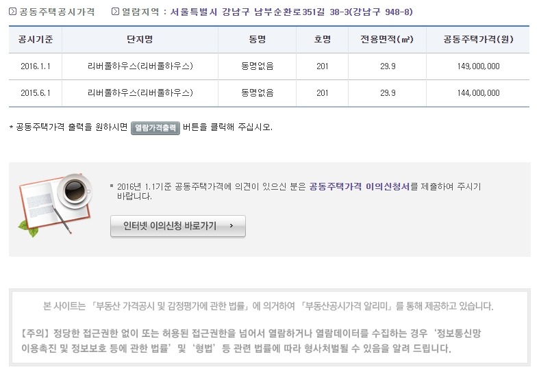 저하고 상관없는 주소지만 임의로 서울 강남구 남부순환로의 리버풀 하우스 201호의 개별공시지가를 열람해 보도록 하겠습니다.